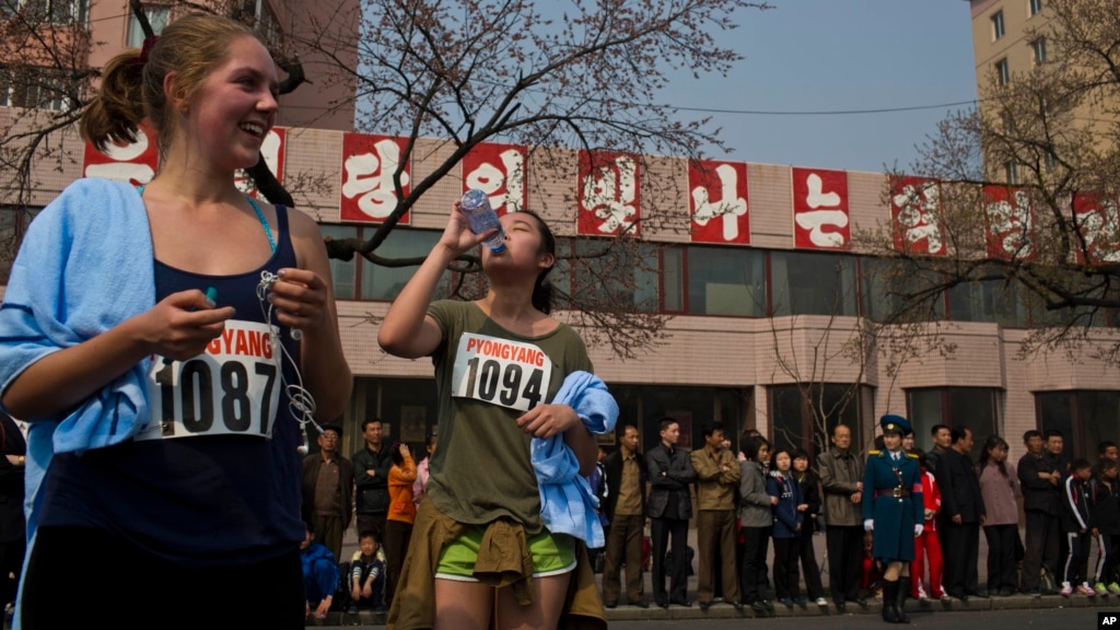 지난해 4월 북한에서 열린 평양 국제마라톤 대회에서 경기를 마친 선수들이 물을 마시고 있다.