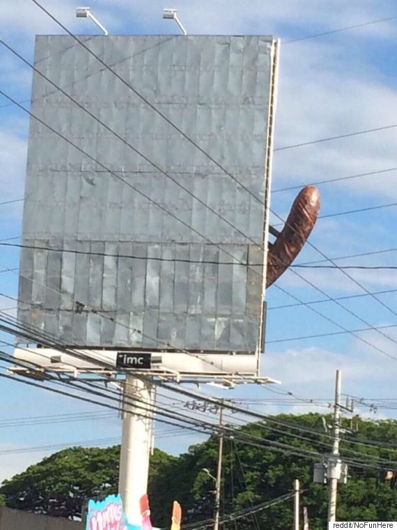 광고판에 부착된 길고 두껍고, 위로 치솟은 조형물은 분명히 남성의 성기를 연상시킨다. 도대체 어떤 제품을 알리는 광고인 걸까? ‘ NoFunHere’는 돌아오던 길에 찍은 같은 광고판의 또 다른 사진도 공개했다.
